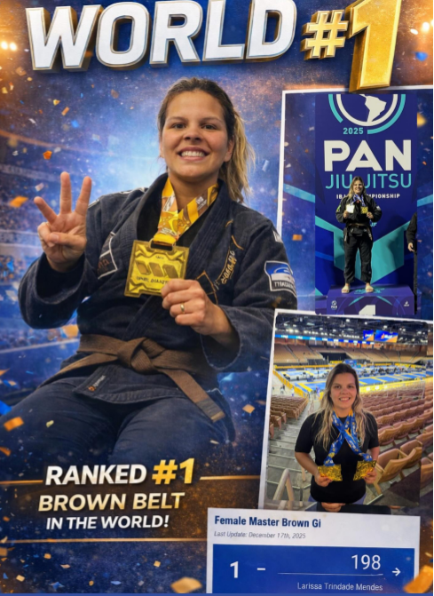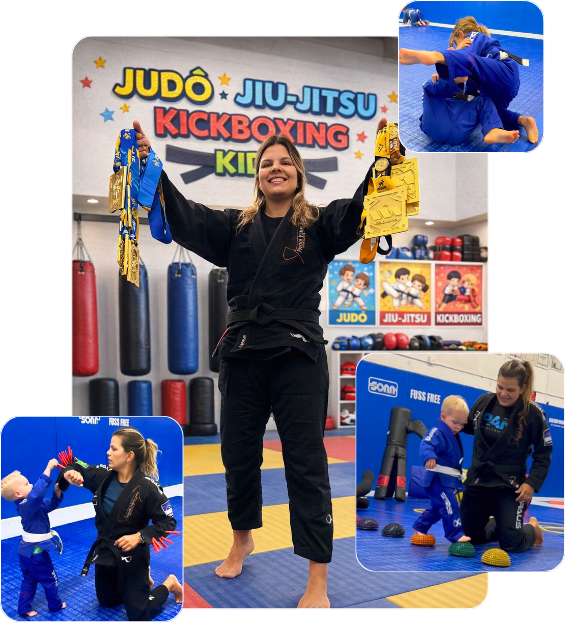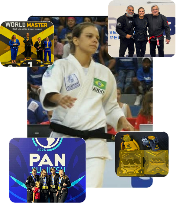 Coach Larissa Trindade is a black belt in Judo and Jiu-Jitsu and a brown belt in Kickboxing, with over 20 years of experience in martial arts and high-level coaching.